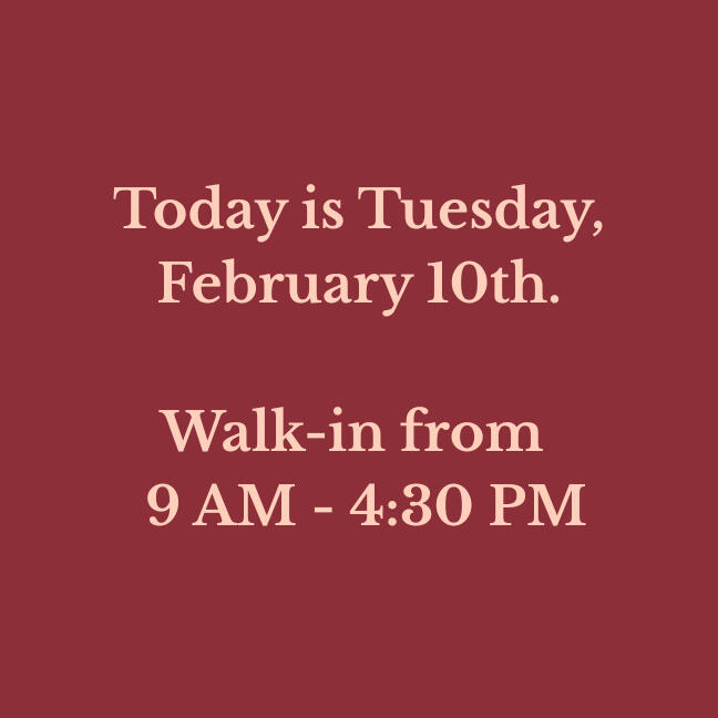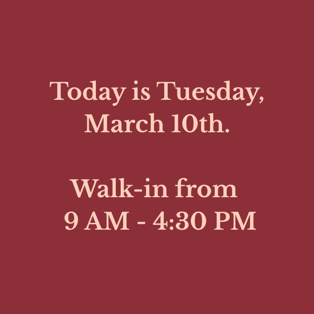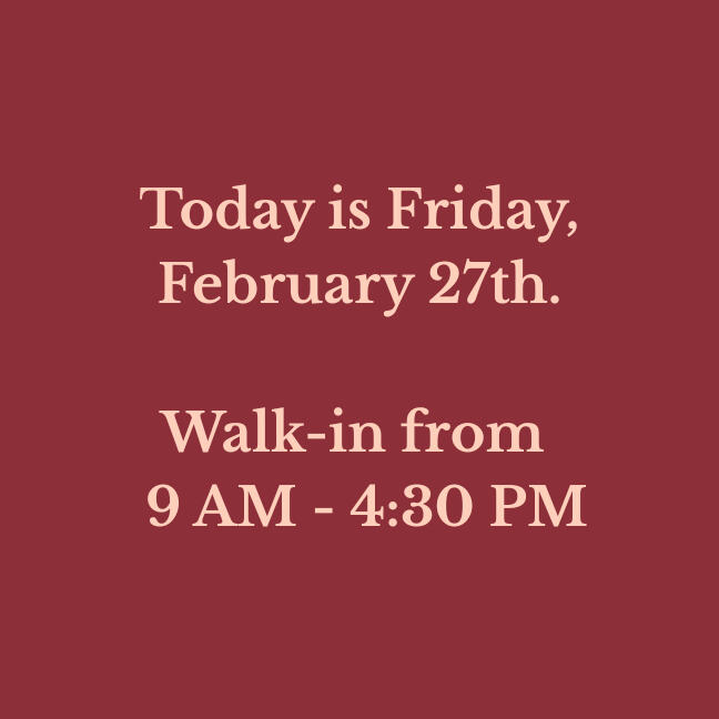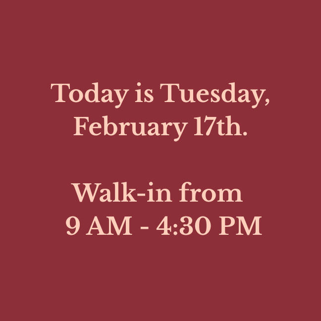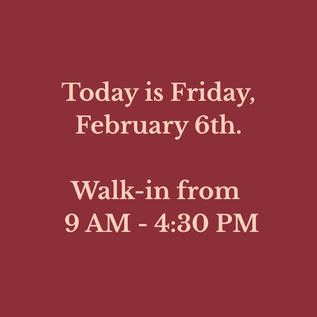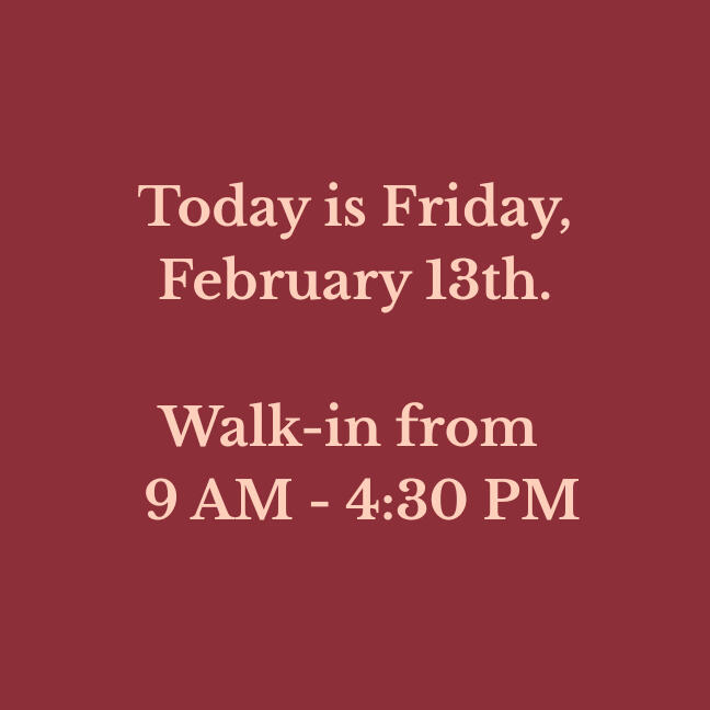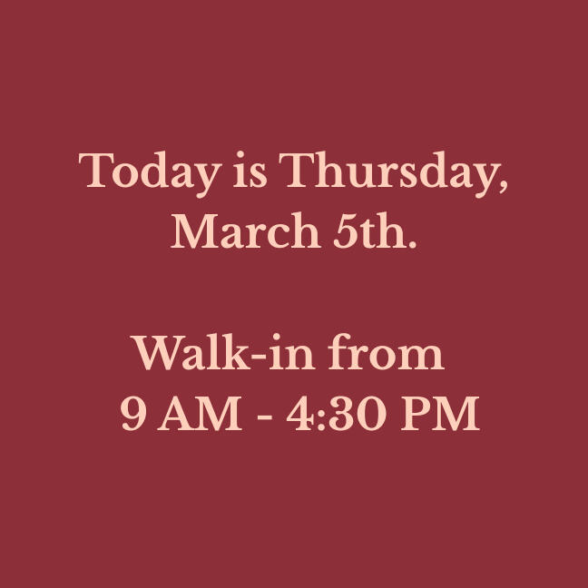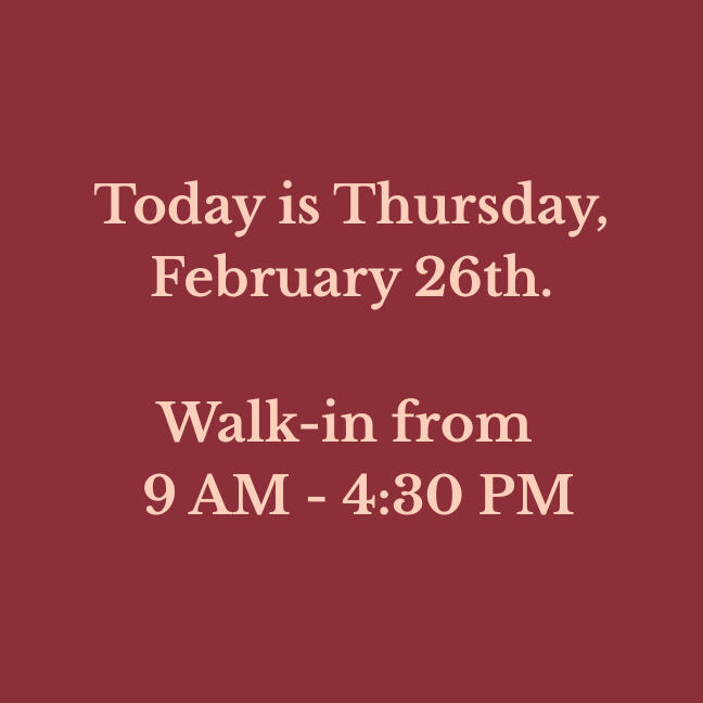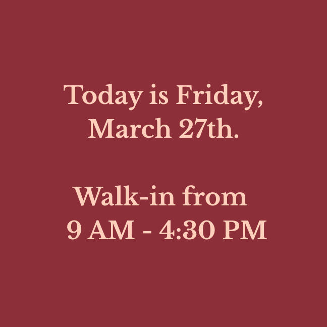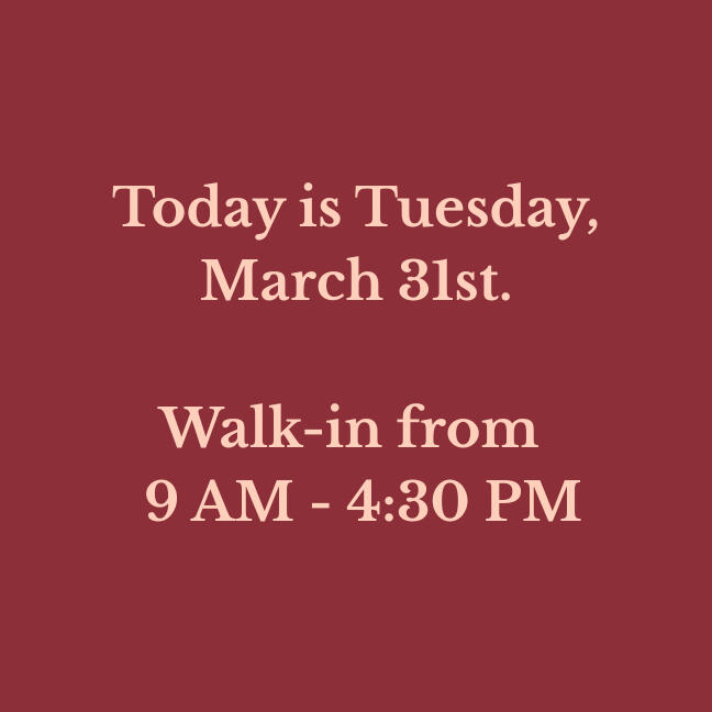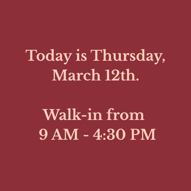Our walk-in hours are updated daily. Verify before you drive!