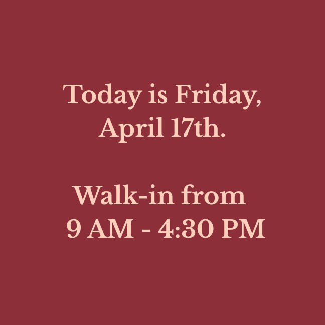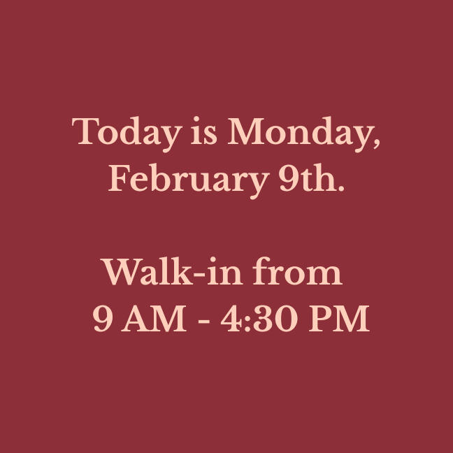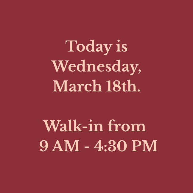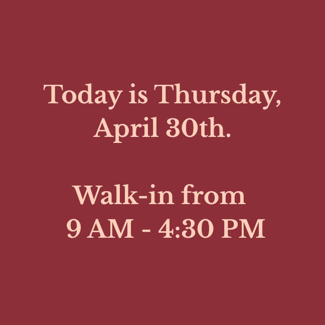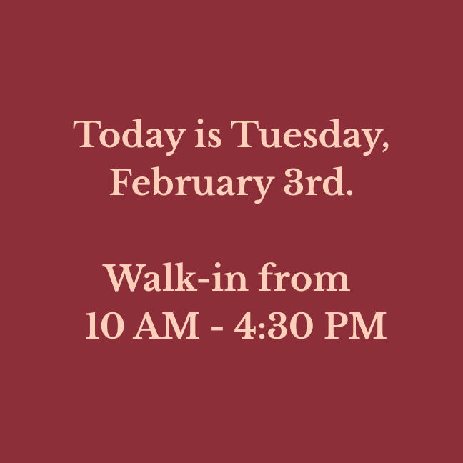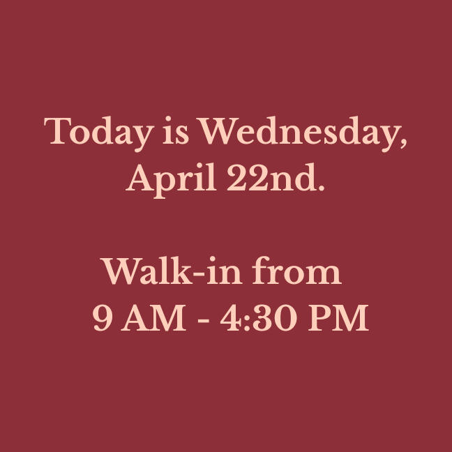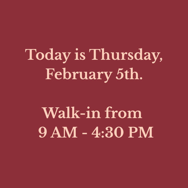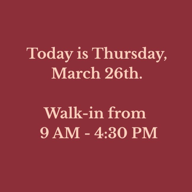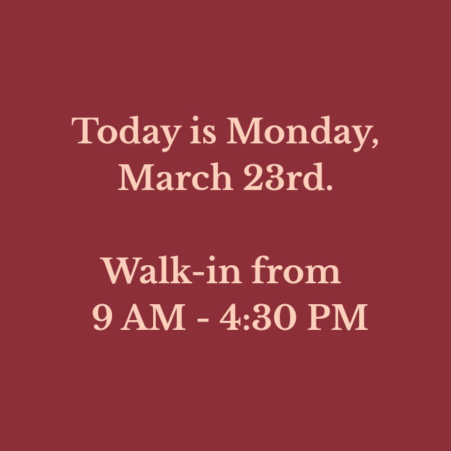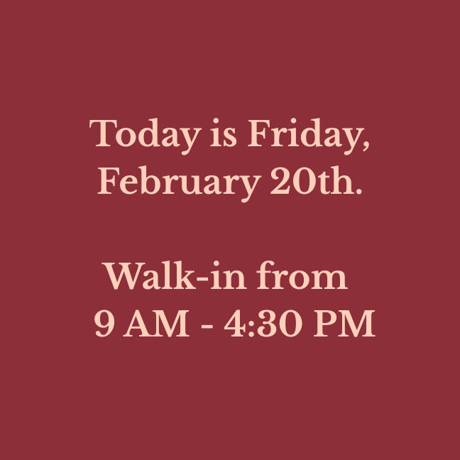 Our walk-in hours are updated daily. Verify before you drive!